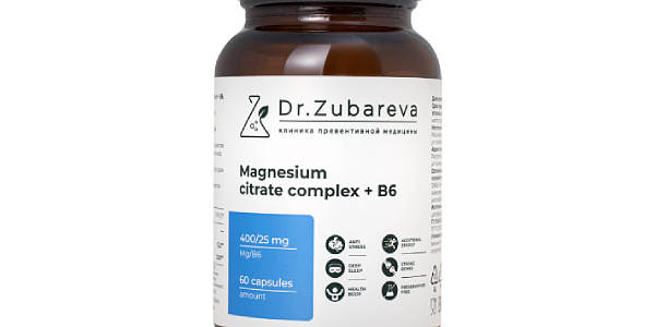 Комплексная пищевая добавка Магния цитрат+В6 ДР. ЗУБАРЕВА, капсулы, 60 штДР. ЗУБАРЕВАМагний необходим организму для нормальной работы сердца, здоровья нервной системы, поддержания нормального уровня сахара в крови, артериального давления, сократительной способности мышц, плотности костной ткани. Он участвует во многих биохимических реакциях, ежедневно протекающих в организме, и относится к группе жизненно важных нутриентов. Цитрат магния — это одна из органических солей, которая используется для производства современных магнийсодержащих препаратов и представляет собой соединение макроэлемента и лимонной кислоты.